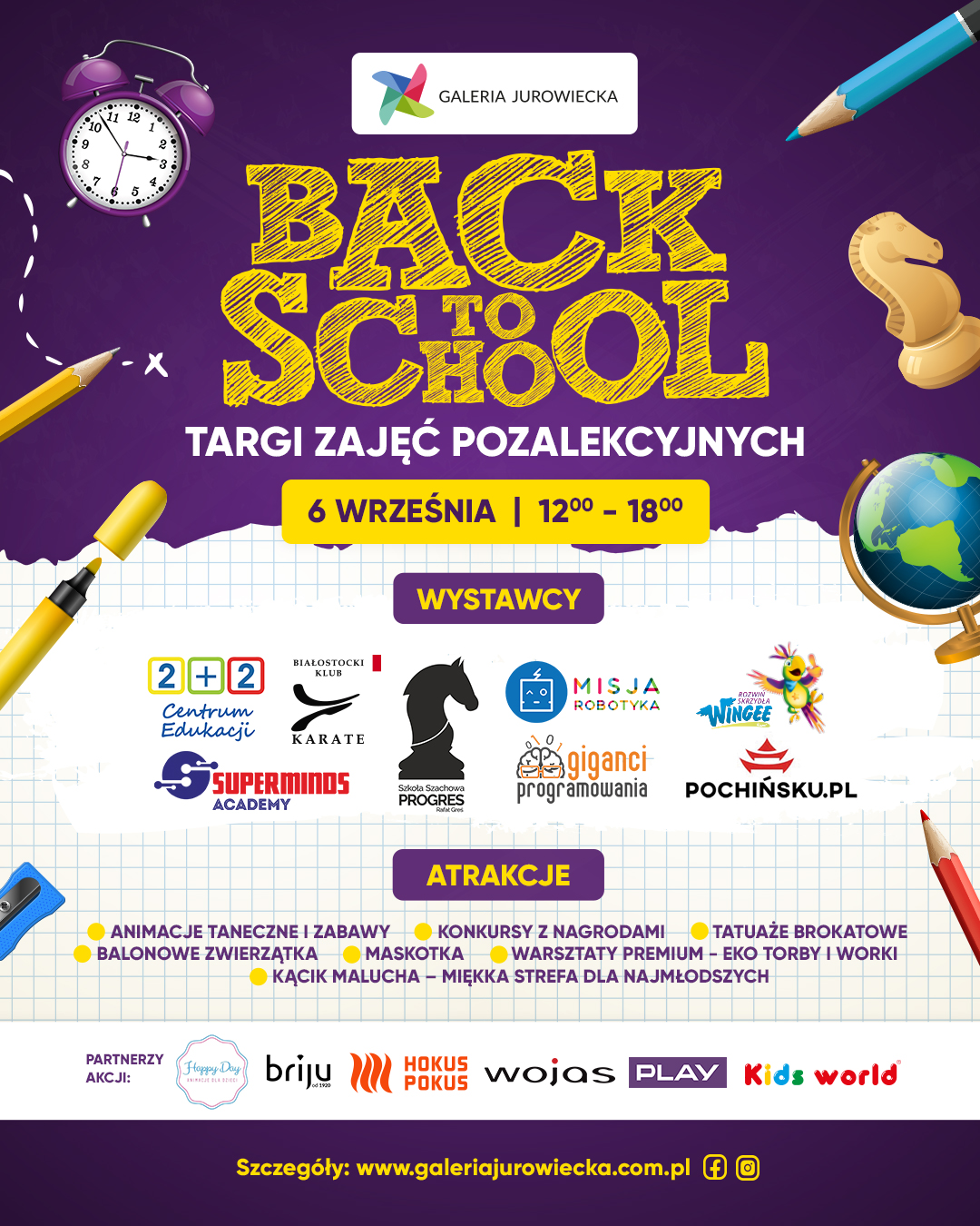 Galeria Jurowiecka wspólnie z  HappyDay- animacje dla dzieci zapraszają na Back to school – targi zajęć pozalekcyjnych!☀️