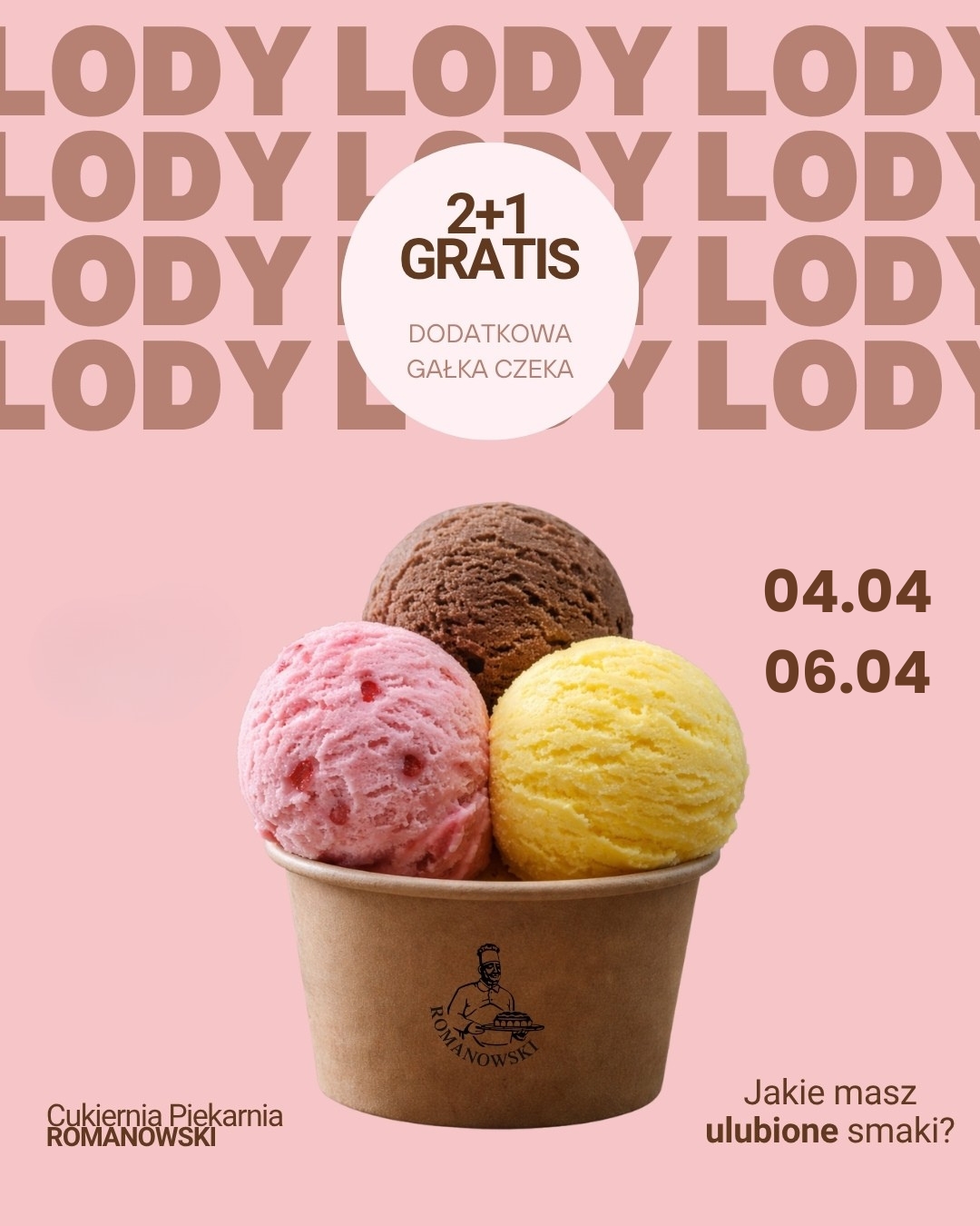 W dniach 04.04 – 06.04 przy zakupie dwóch gałek lodów, trzecią dostajesz GRATIS 😍