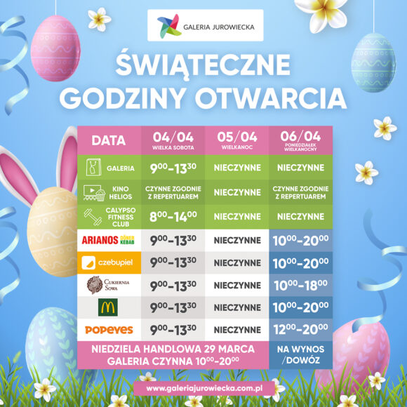 🐣 Sprawdź świąteczne godziny otwarcia Galerii Jurowieckiej! 📅 04.04 (Wielka Sobota) 🛍️ Galeria: 9:00–13:30 🎬 Kino Helios: zgodnie z repertuarem 💪 Calypso Fitness Club: 8:00–14:00 🍴 Wybrane lokale gastronomiczne: 9:00–13:30 📅 05.04 (Wielkanoc) ❌ Galeria i większość lokali: nieczynne 📅 06.04 (Poniedziałek Wielkanocny) 🛍️ Galeria: nieczynna 🎬 Kino Helios: zgodnie z repertuarem 🍴 Wybrane lokale...
